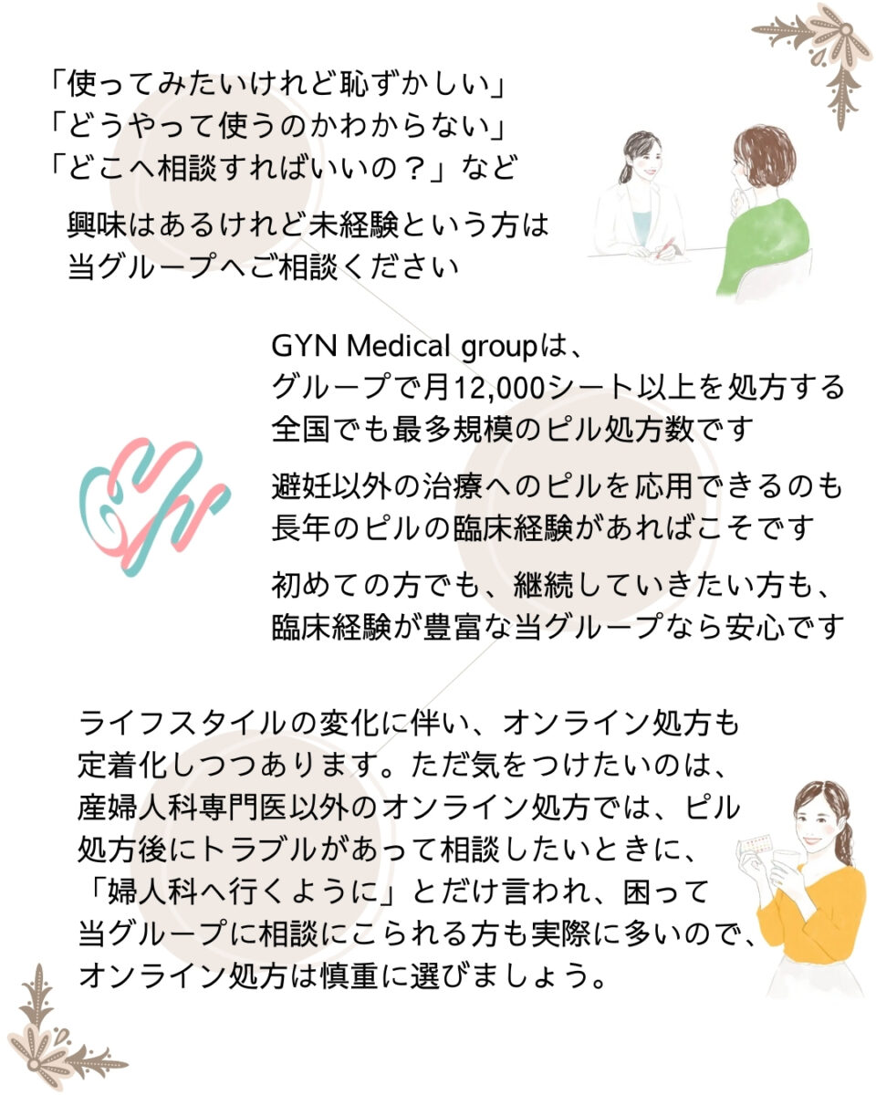 ピルの何列目を服用しているか、飲み忘れ後の性交渉の有無、今回の飲み忘れ以外で正しく服用できていたか、などの様々な状況により、対処法が異なる場合がありますので、ピルに精通した医療機関をかかりつけにもち、不安があれば必ず相談しましょう。