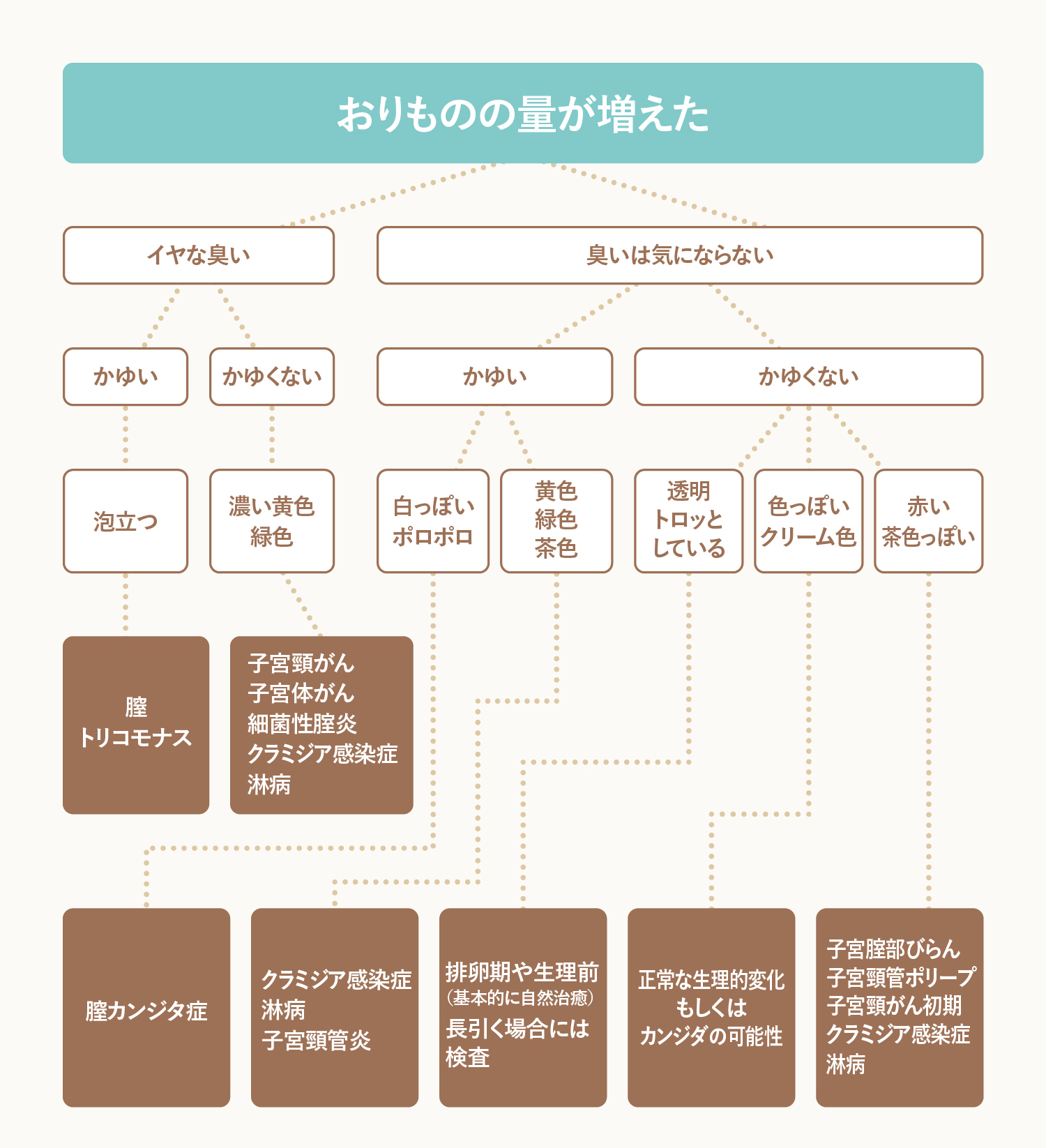 いつもと違う匂い、下腹部痛がある→クラミジア感染症・淋菌感染症 - ポロポロした酒粕状で白いおりものが増加→ カンジダ腟炎